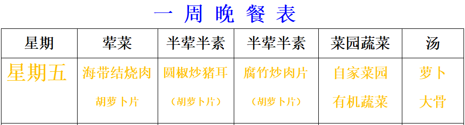 星期五:海带结烧肉胡萝卜片       圆椒炒猪耳(胡萝卜片)      腐竹炒肉片(胡萝卜片)         自家菜园有机蔬菜          萝卜大骨